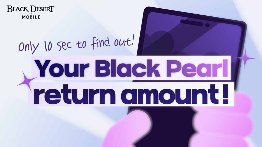 Gráfico promocional do “Black Desert Mobile” destacando uma oferta de pelo menos 10.000 pérolas negras.