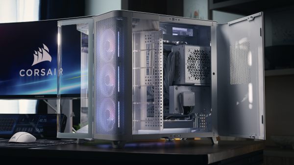 Disponível em preto ou branco, a AIR 5400 é fornecida com 3x RS120-R PWM ARGB ou 3x ventoinhas de rotor invertido iCUE LINK LX120-R. Em ambos os modelos, as ventoinhas de entrada estão pré-instaladas na parte inferior da caixa para fornecer ar frio à GPU.