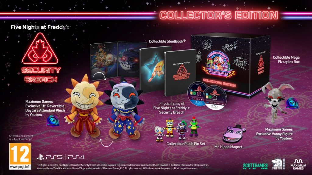 Uma novíssima Edição de Colecionador de Five Nights at Freddy’s: Security Breach irá chegar às lojas neste outono, anunciou hoje a editora Maximum Games. Esta edição limitada inclui o jogo Five Nights at Freddy’s: Security Breach, um SteelBook colecionável, uma figura exclusiva Vanny, um peluche reversível da Youtooz, um conjunto de pins e muito mais! Os fãs que estiverem a morrer de vontade de colocar as mãos nesta edição especial de colecionador podem fazer já a sua reserva do jogo para PS4 e PS5 a partir de 29 de abril de 2022.