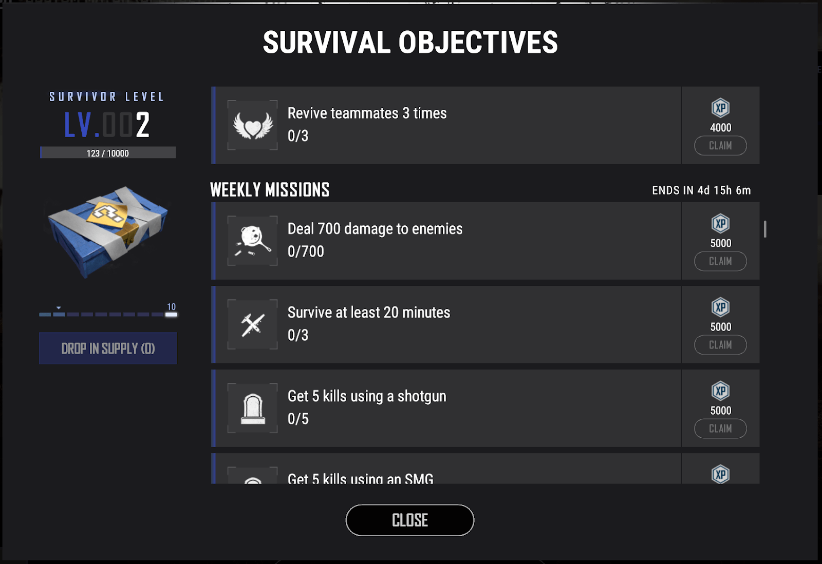 - O Suppy System que dá recompensas com base em missões concluídas e tempo de jogo. Faz-te subir de nível e receberes recompensas sempre que preencheres o medidor de Sobrevivência com a Survival XP. As missões serão actualizadas diariamente e semanalmente. Ganhas uma recompensa cada vez que ganhas um nível de sobrevivência, portanto a cada level up.