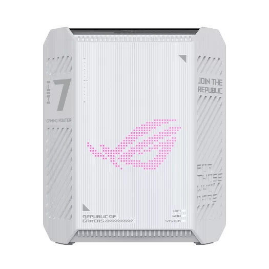 O ROG Strix GS-BE7200 é um router gaming WiFi 7 elegante e compacto, concebido para elevar as configurações com desempenho e estilo. O acabamento totalmente branco e as linhas limpas conferem-lhe um aspeto minimalista que se enquadra perfeitamente em qualquer estação de combate moderna, enquanto o painel superior semi-transparente caraterístico revela padrões ROG em camadas e detalhes subtis.